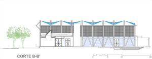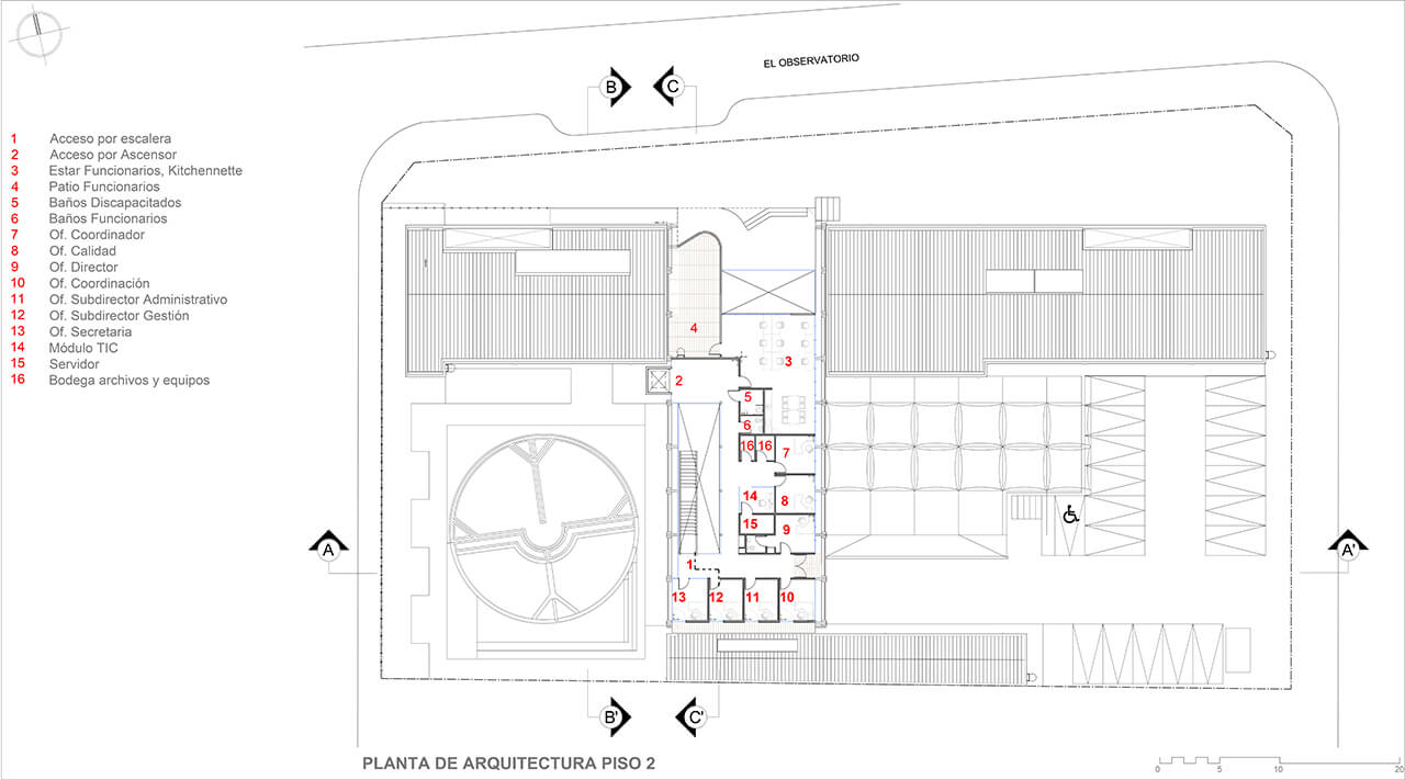 El edificio central de dos pisos se resolvió con un sistema constructivo – estructural en exo – estructura de pilares compuestos, vigas, diagonales y losas con el propósito de acentuar la presencia del volumen en un contexto urbano de baja altura. La estructura expuesta permite una segunda fachada con celosías fijas en el segundo nivel de todo el volumen que filtran la luz solar