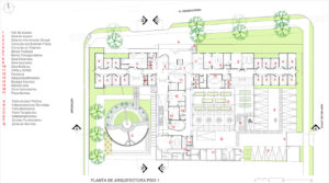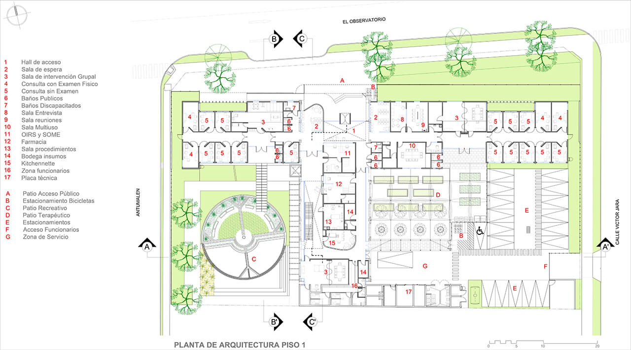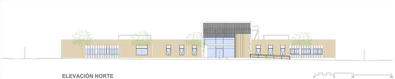 Esto permite configurar dos patios contenidos caracterizados según el proyecto de áreas exteriores y paisajismo. Uno es para actividades recreativas y el otro tiene carácter terapéutico.