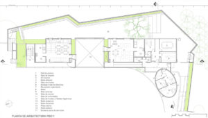Los espacios y recintos se plantean en una linealidad secuencial, vinculados por la circulación de pasillo, escaleras, rampas, etc. y un espacio exterior, patio hundido, que acompaña a la volumetría casi en su totalidad. Este patio es articulador y también espacio recreacional.